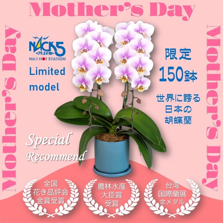 2026[NACK5番組スポンサー記念] 3/20夜0:00~販売開始【5/6昼12:00までの注文で5/10(土)配送】限定 モテギ洋蘭園 母の日用ミディ胡蝶蘭ピンク 2本立 特典付き
